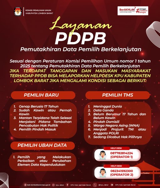 KPU Kabupaten Lombok Barat melayani Pemutakhiran Data Pemilih Berkelajutan (PDPB) untuk melakukan pemutakhiran data pemilih secara berkelanjutan pada pemilihan umum dan/atau pemilihan berikutnya, perlu ketersediaan data dan informasi pemilih secara komprehensif, akurat, dan terkini dengan memperhatikan data kependudukan sesuai dengan ketentuan peraturan perundang-undangan.