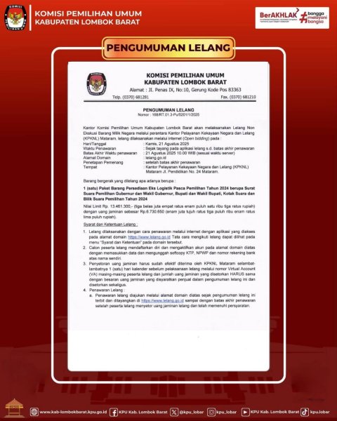 Komisi Pemilihan Umum Kabupaten Lombok Barat akan melaksanakan Lelang Non Eksekusi barang Milik Negara melalui perantara Kantor Pelayanan Kekayaan Negara dan Lelang (KPKNL) Mataram.
