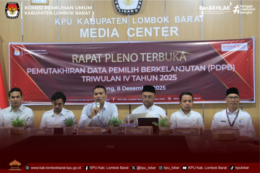 #TemanPemilih, Komisi Pemilihan Umum (KPU) Kabupaten Lombok Barat telah menggelar Rapat Pleno Terbuka Rekapitulasi Pemutakhiran Data Pemilih Berkelanjutan (PDPB) Triwulan IV Tahun 2025. Acara yang berlangsung di Aula Kantor KPU Kabupaten Lombok pada Senin (08/12/2025) ini menghasilkan penetapan jumlah pemilih terbaru untuk persiapan agenda demokrasi mendatang.