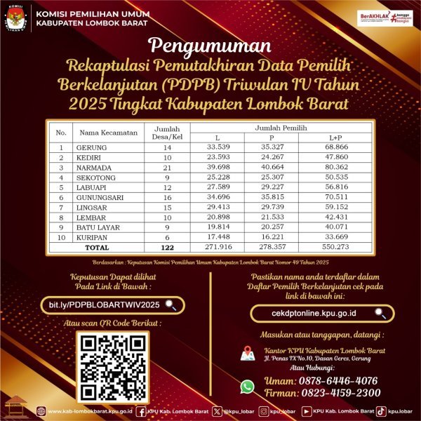 #TemanPemilih Berikut pengumuman rekapitulasi Pemutakhiran Data Pemilih Berkelanjutan (PDPB) Triwulan IV Tahun 2025 Tingkat Kabupaten Lombok Barat.
