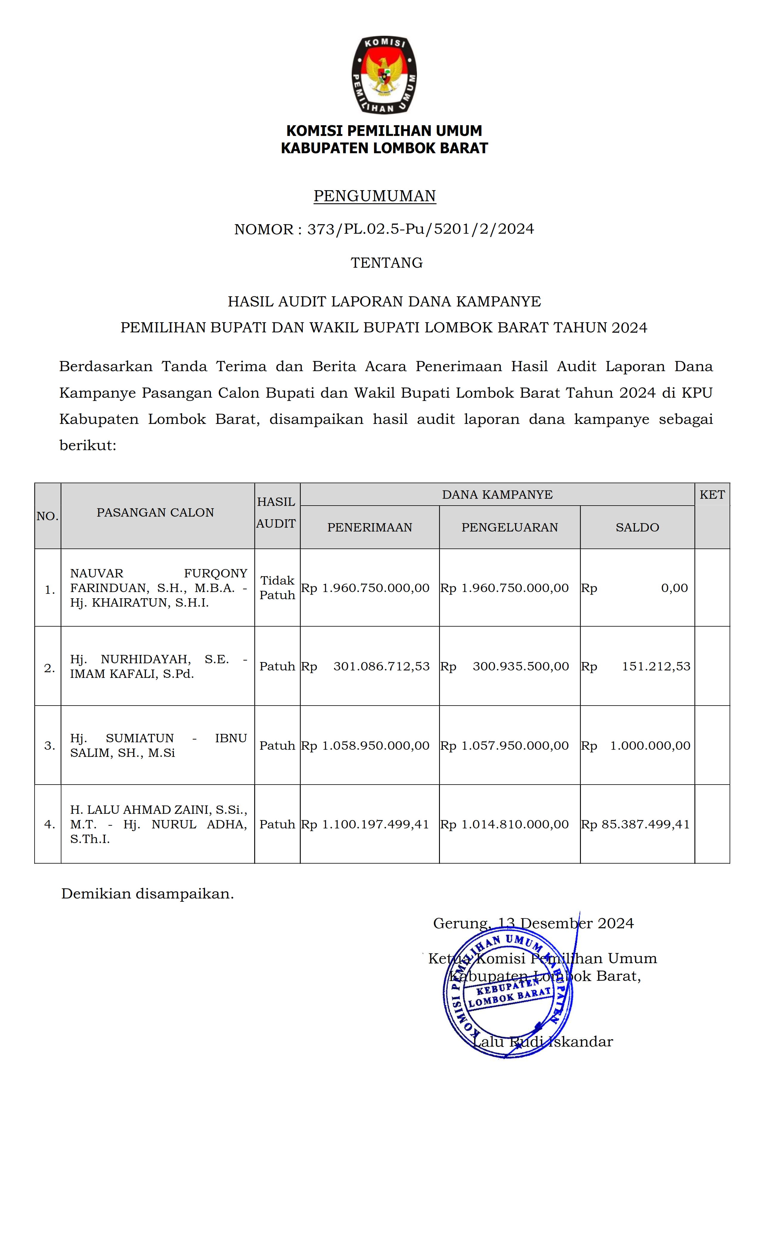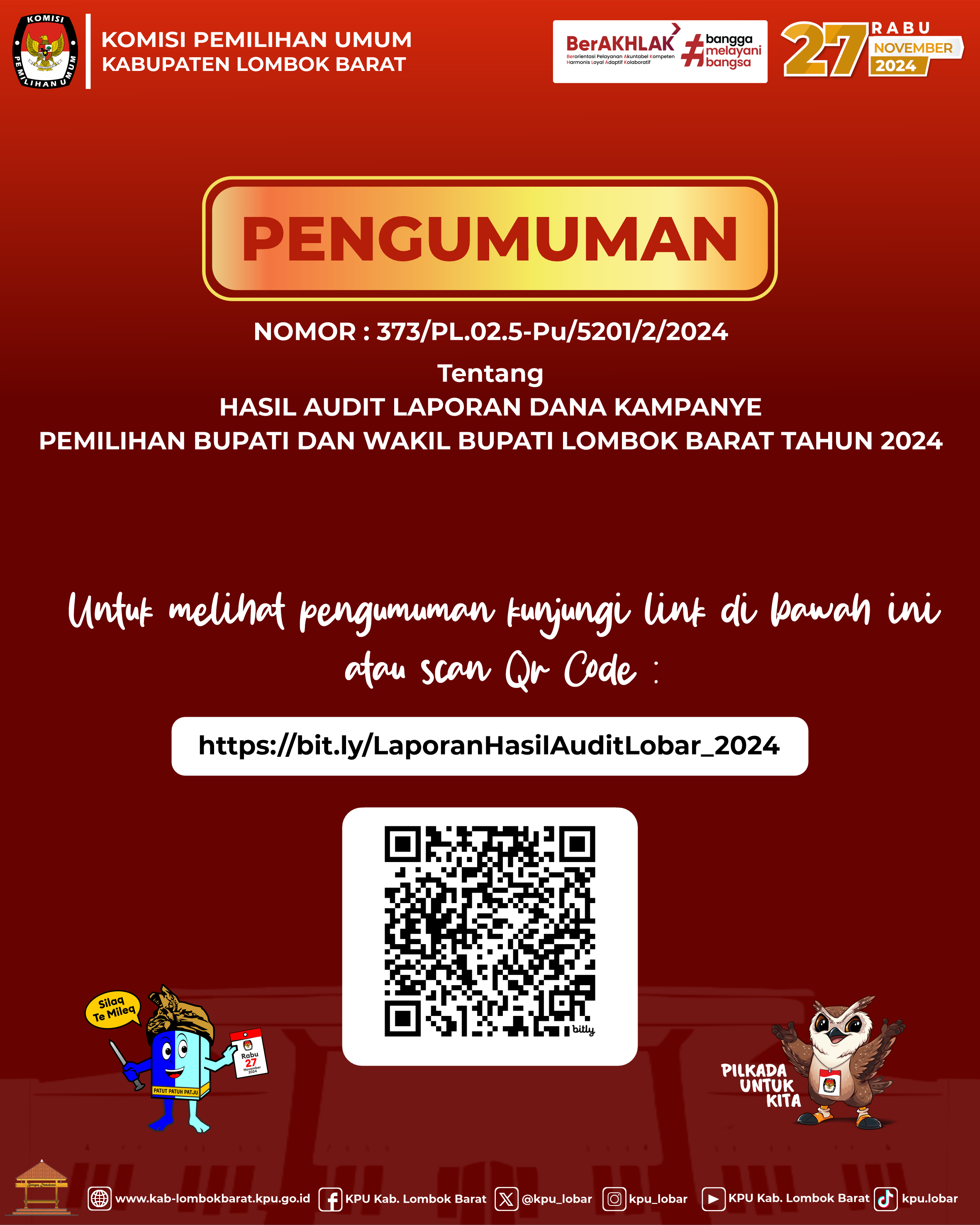 #TemanPemilih Berikut adalah Pengumuman hasil audit laporan dana kampanye pemilihan Bupati dan Wakil Bupati Lombok Barat Tahun 2024.