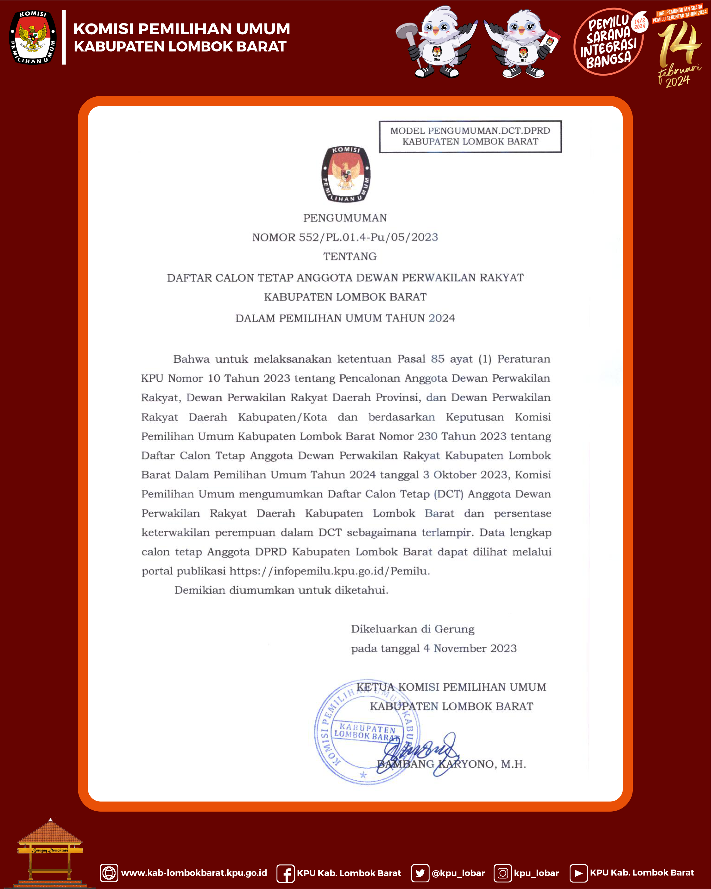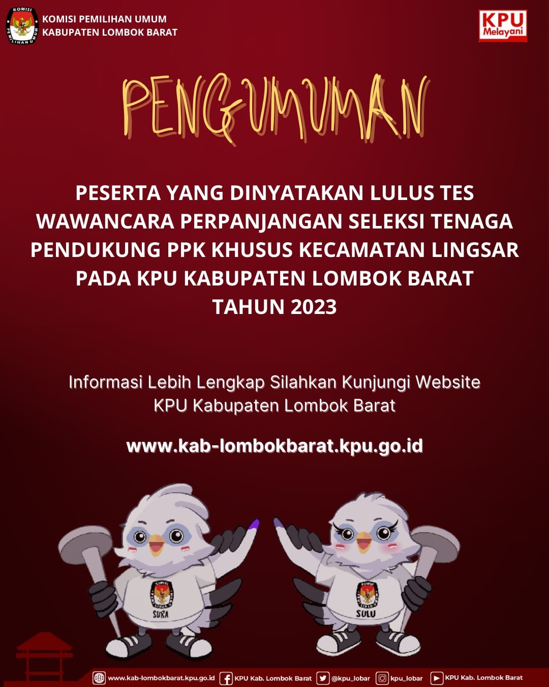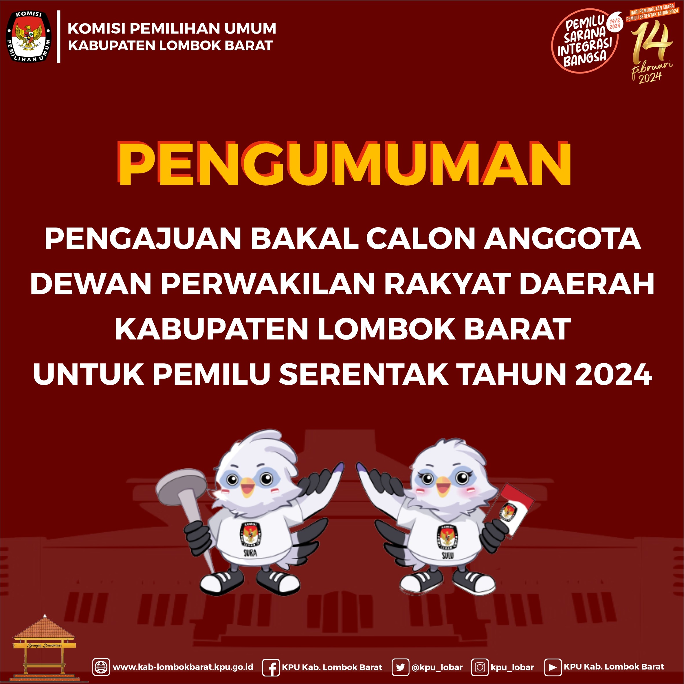 Untuk informasi lebih lanjut silahkan klik link berikut untuk mengunduh Pengumuman Lelang : https://kab-lombokbarat.kpu.go.id/public/kab-lombokbarat/dmdocument/1710738927Pengumuman Lelang KPU Kab. Lombok Barat.pdf