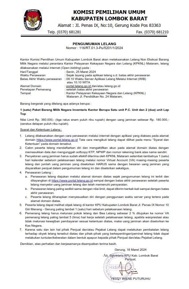 #TemanPemilih, Kantor KPU Kabupaten Lombok Barat akan melaksanakan Lelang Non Eksekusi Barang Milik Negara melalui perantara Kantor Pelayanan Kekayaan Negara dan Lelang (KPKNL).