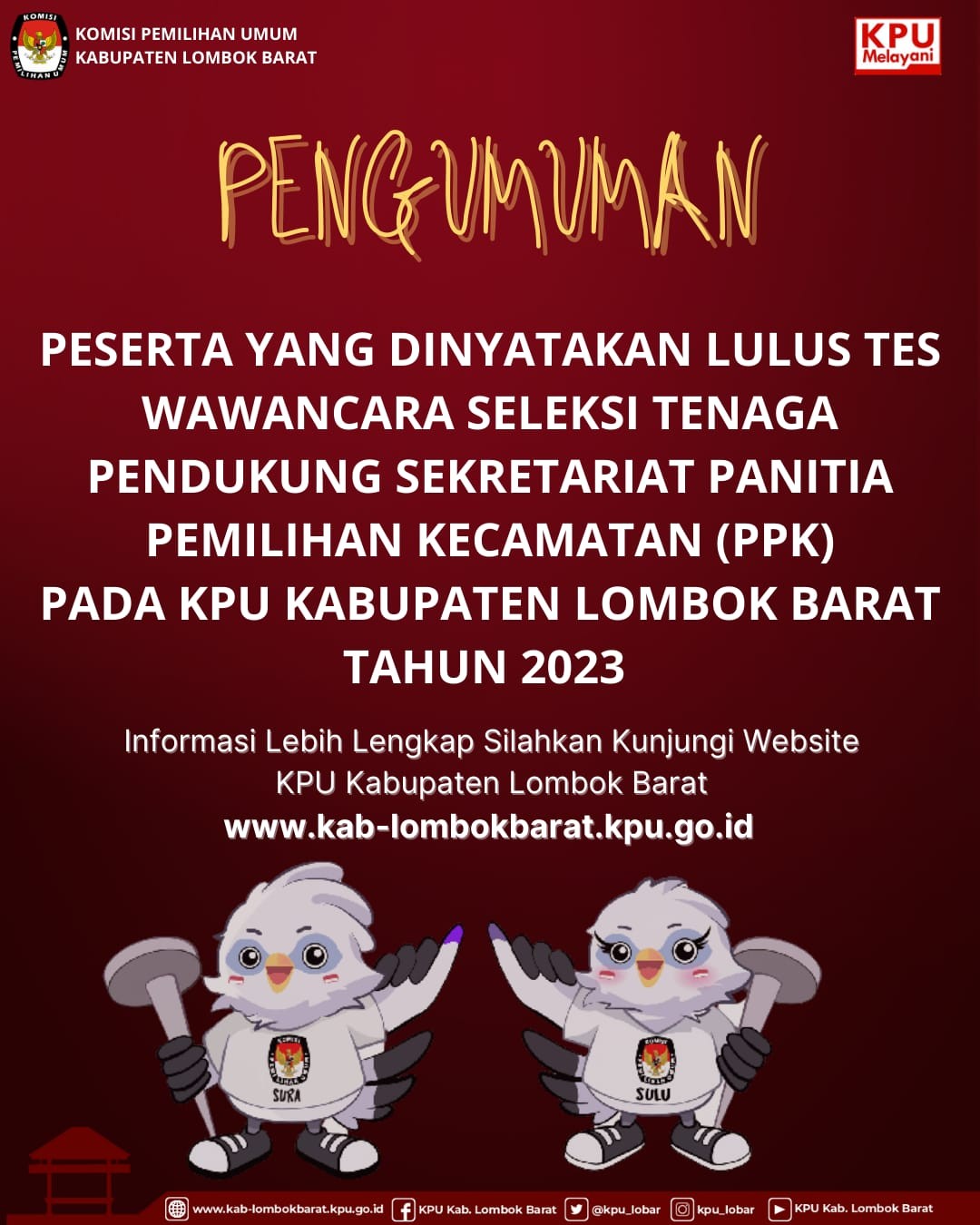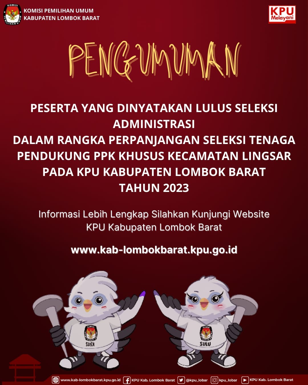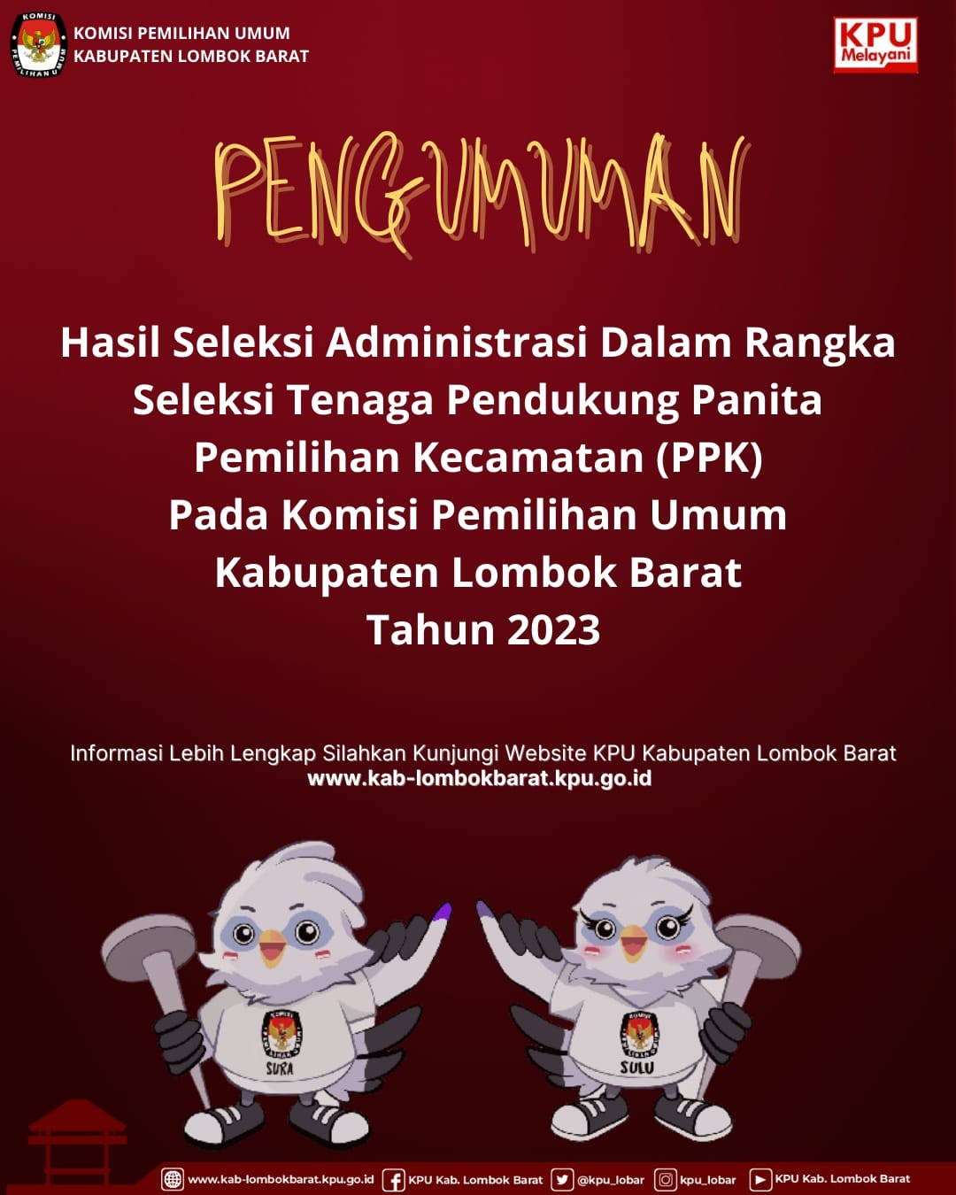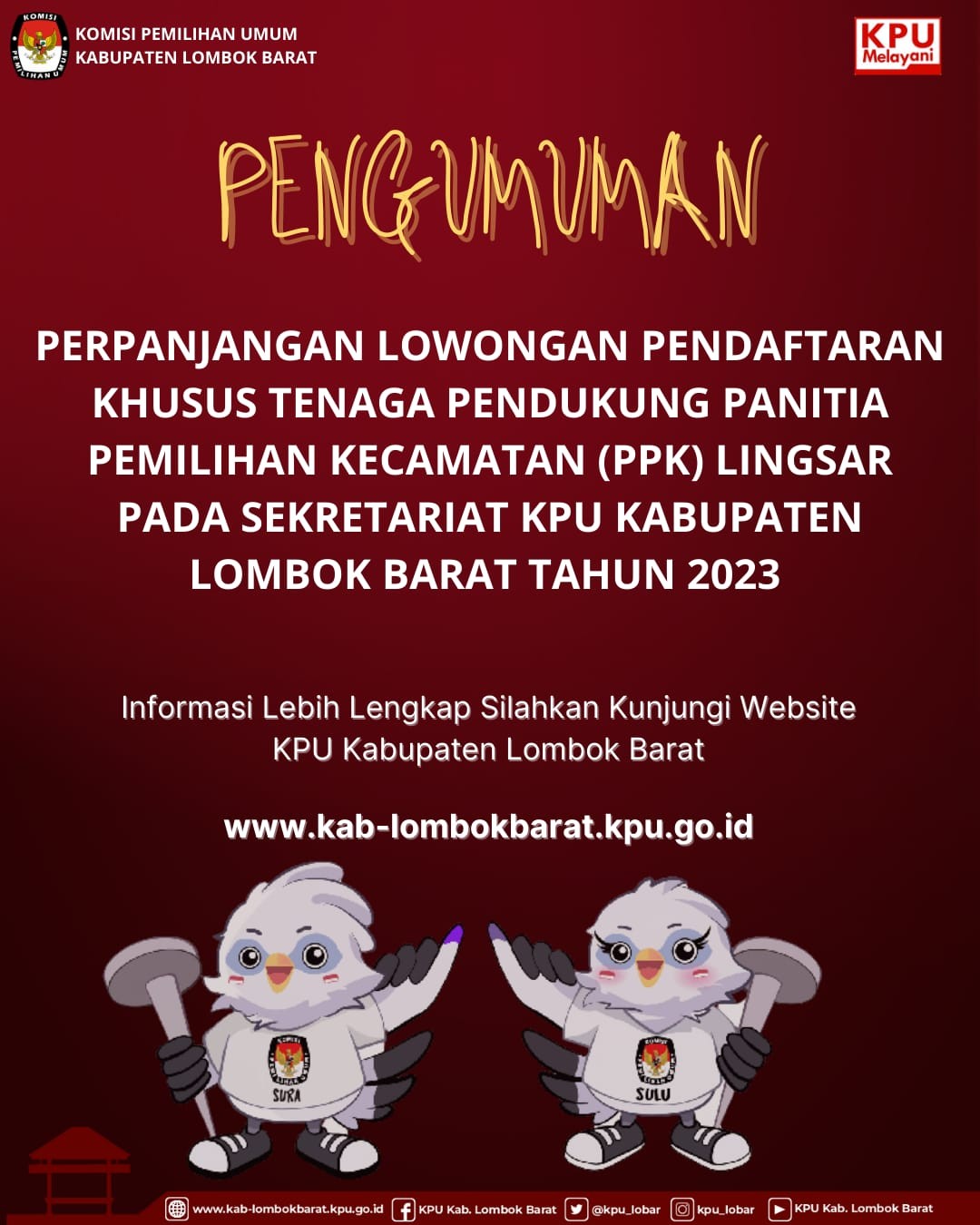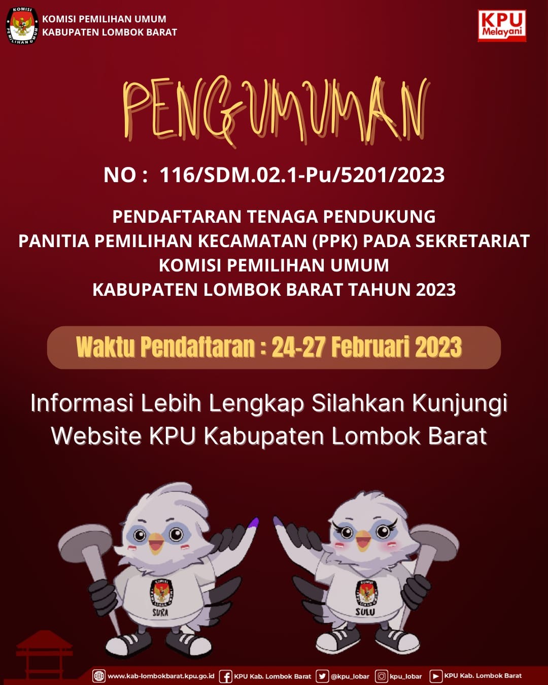 #TemanPemilih Berikut adalah Pengumuman Pendaftaran Tenaga Pendukung Panitia Pemilihan Kecamatan (PPK) Pada Sekretariat KPU Kabupaten Lombok Barat Tahun 2023. Untuk Melihat Persyaratan dan Lain-Lain Silahkan Klik Tautan Berikut : https://kab-lombokbarat.kpu.go.id/public/kab-lombokbarat/dmdocument/1677313017Pengumuman Seleksi Tenaga Adm PPK 2023.pdf
